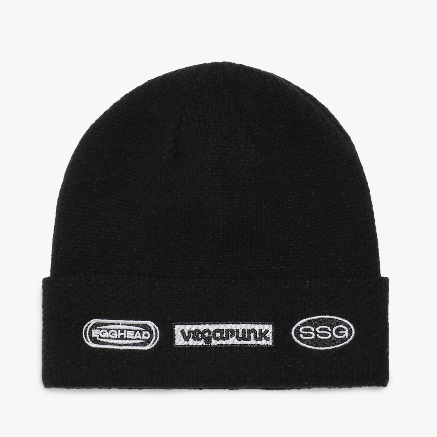 シンプルなワッペンをレイアウトしたグラフィックビーニー。