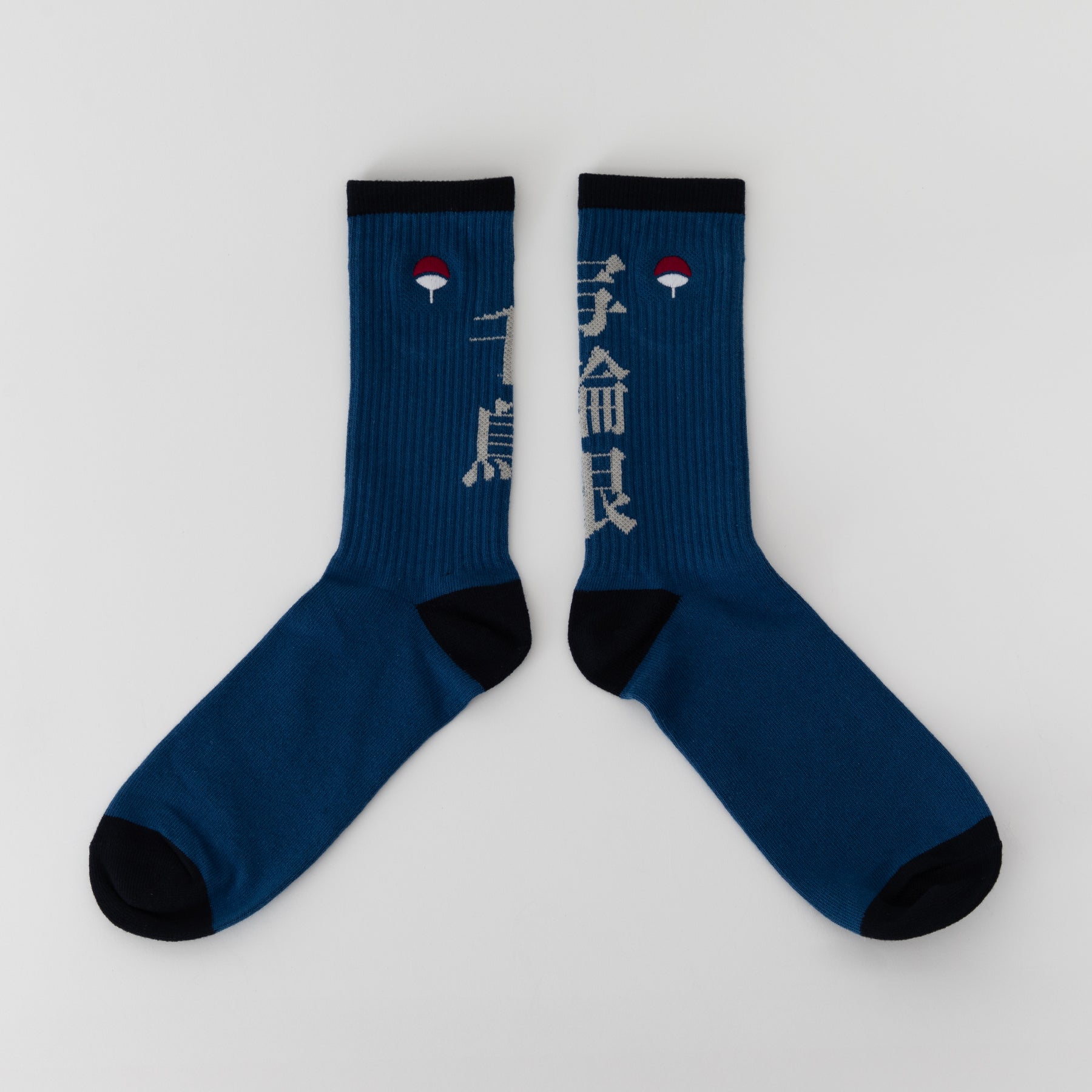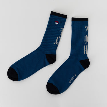 「NARUTO-ナルト-」ソックス。サスケの代表的な技を、大胆なデザインで表現。 迫力を引き立てる大きな漢字をあしらい、テーマカラーでまとめ上げました。 刺繍とジャガード織を組み合わせることで、高級感があり、履き心地にも優れたソックスに仕上げています。