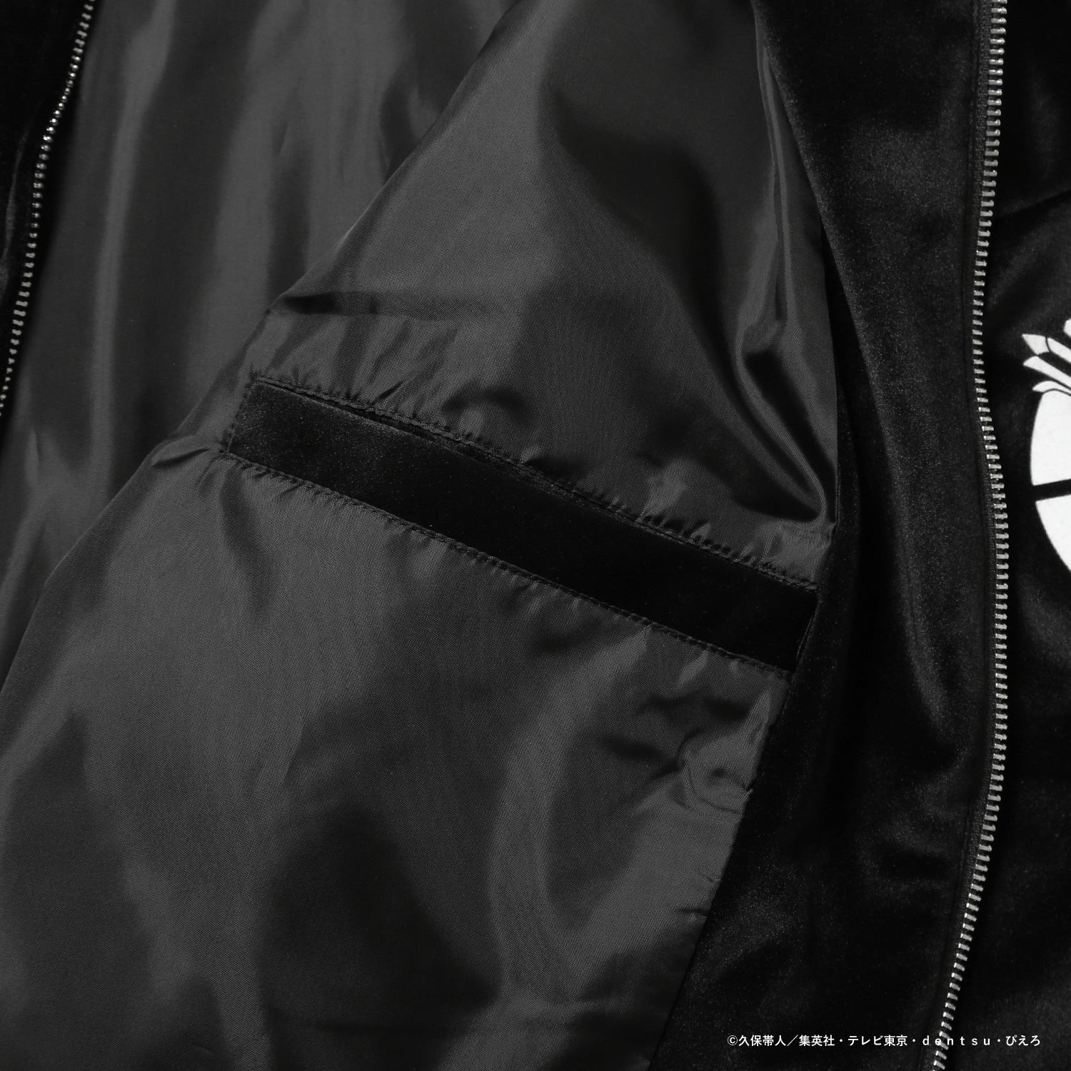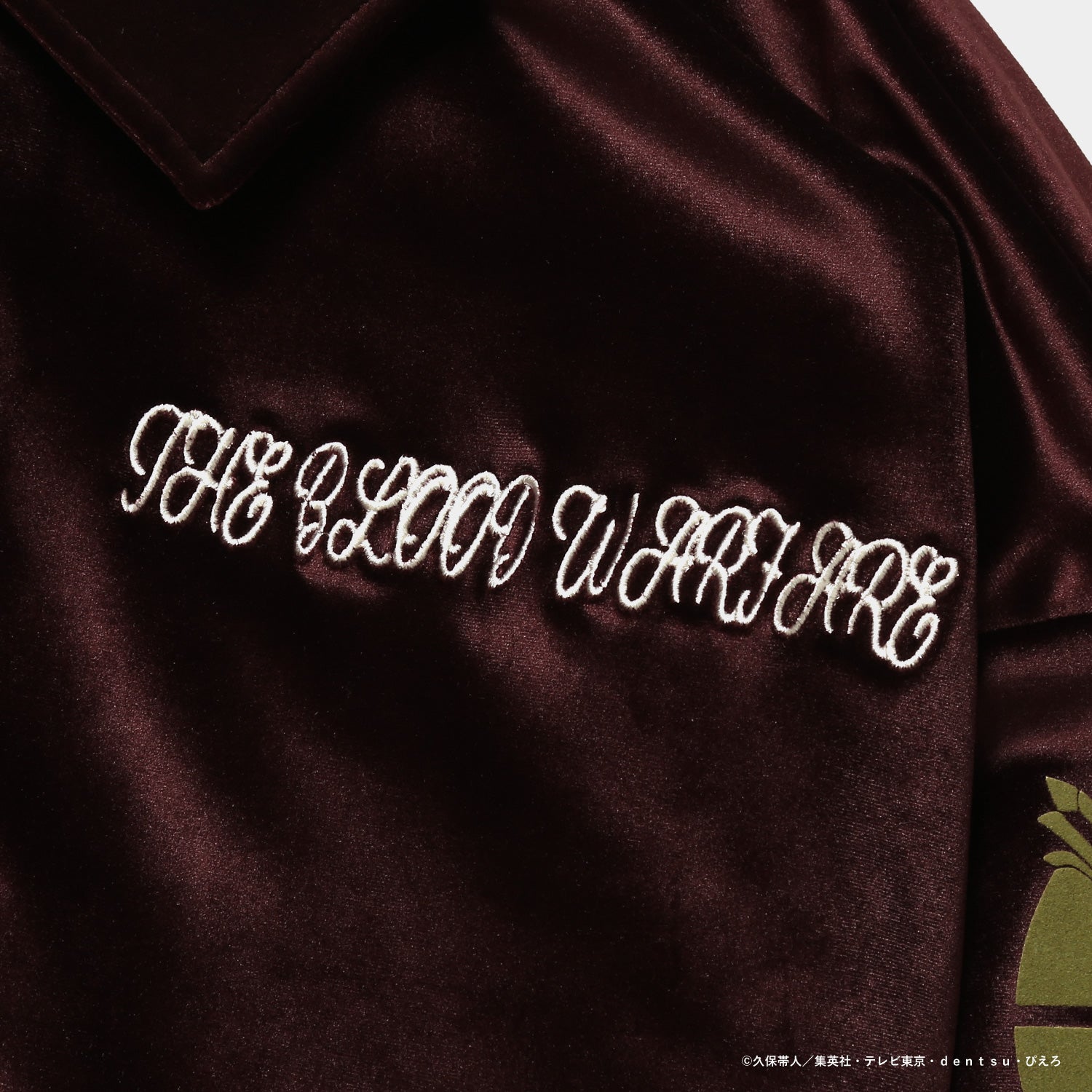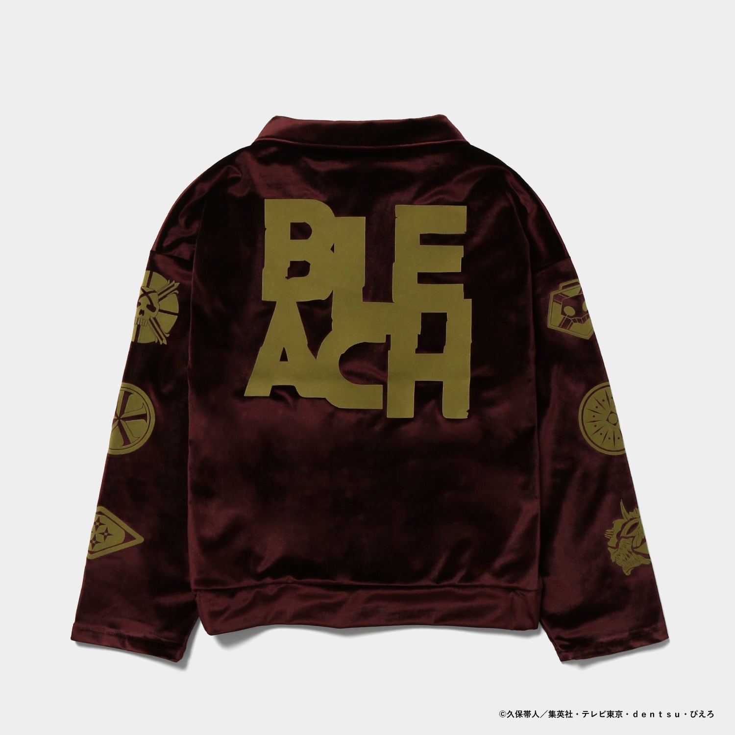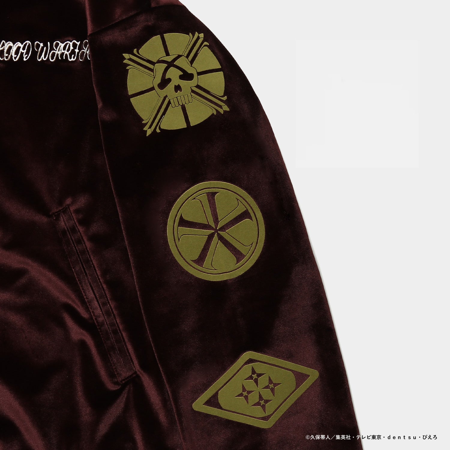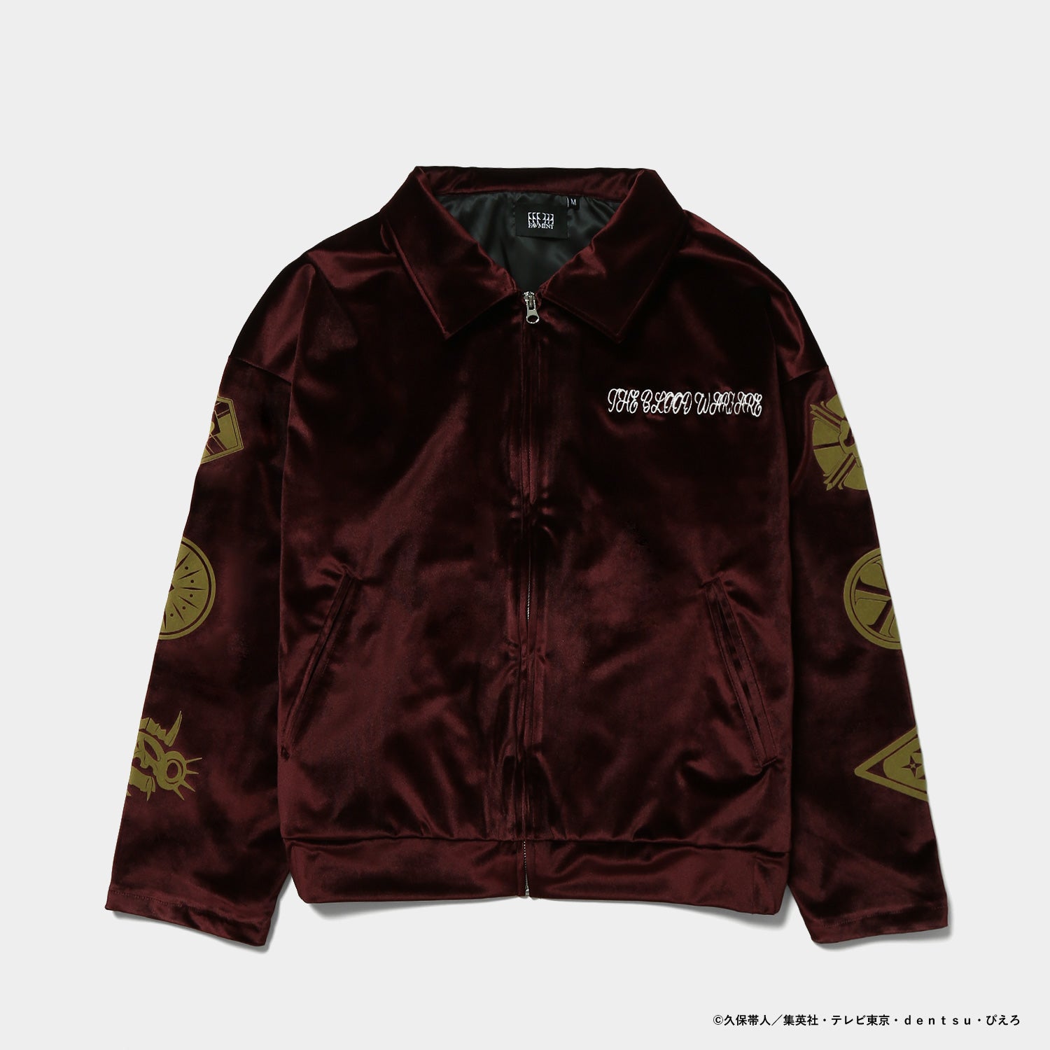 モチーフをあしらったオリジナルデザインのジャケット。上品なベロア素材に、背面のロゴと胸元の刺繍がアクセントを添えます。カラーはブラックとバーガンディの2色展開。