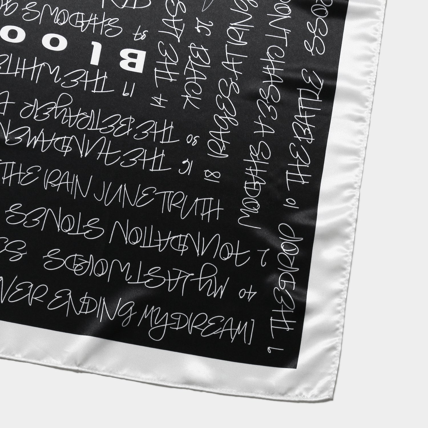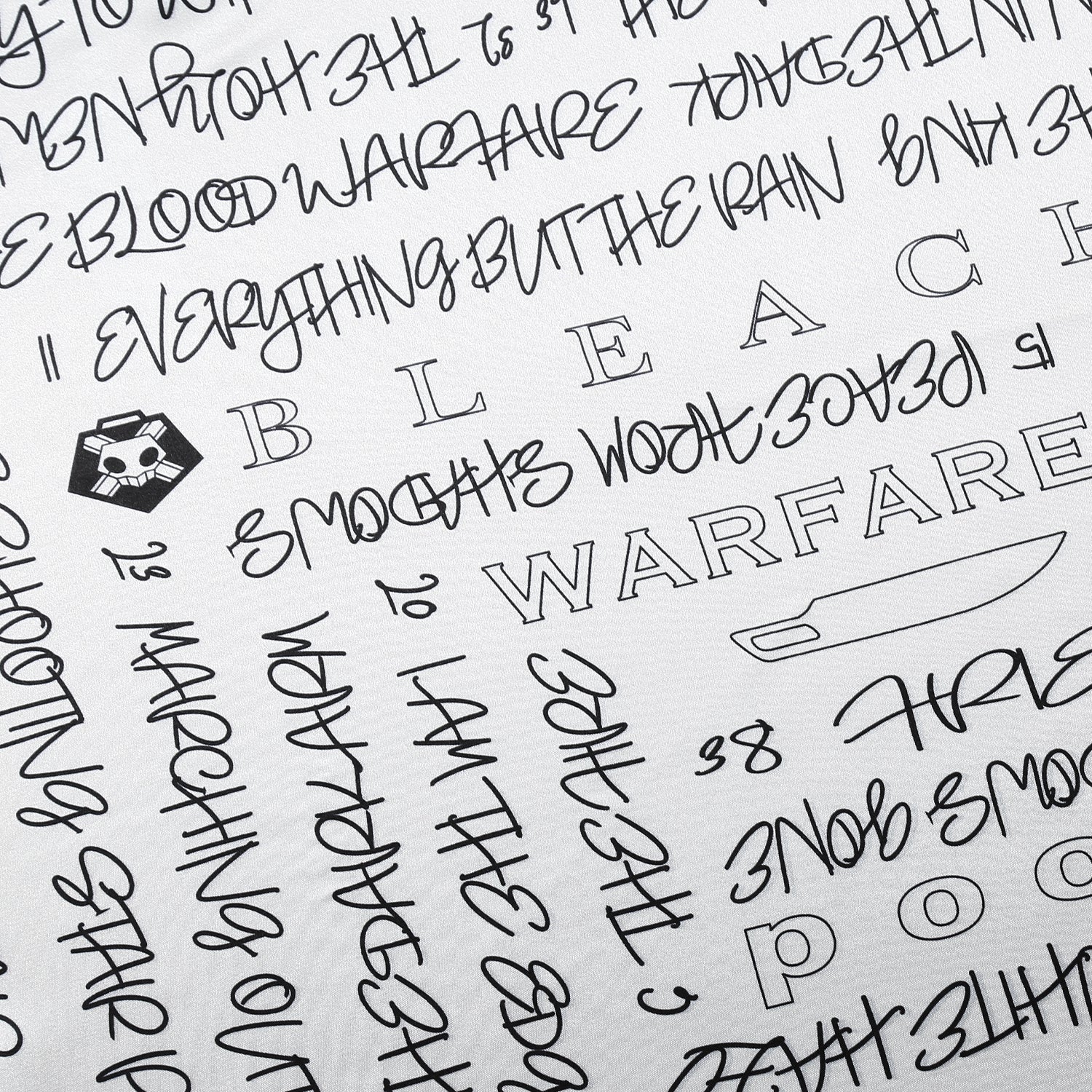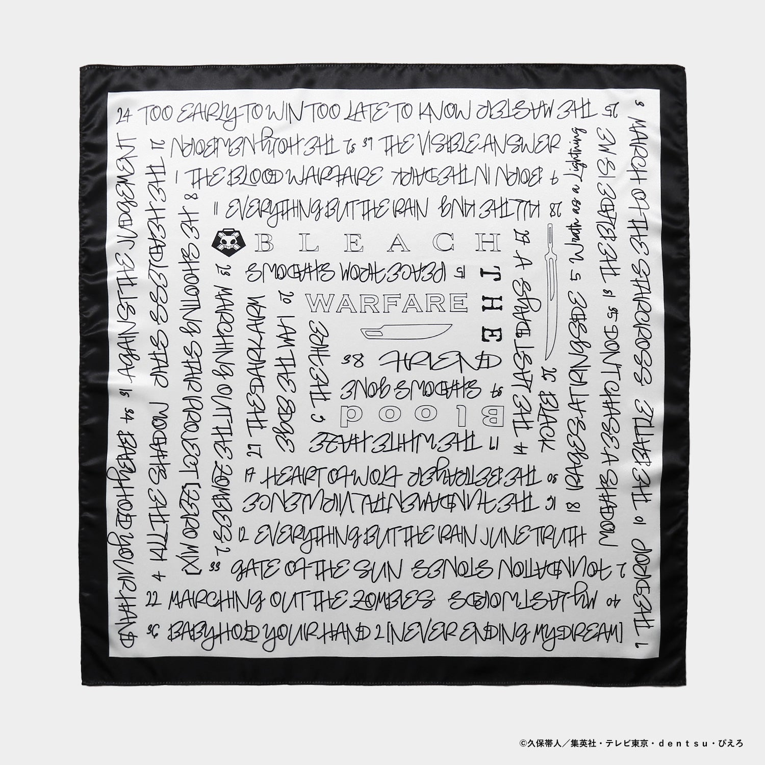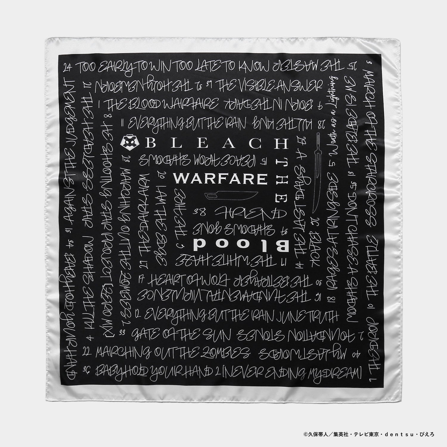 TVアニメ『BLEACH 千年血戦篇』第1話~第40話のサブタイトルをデザインしたレタリングスカーフ。光沢感のある素材を使用し、上品でモダンな雰囲気に仕上げました。